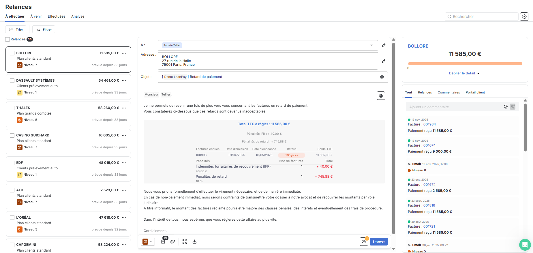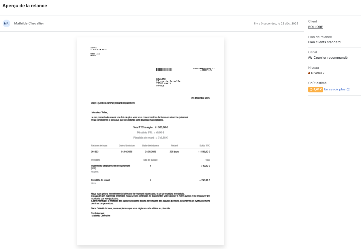 The integration of LeanPay with MySendingBox allows you to send reminders by simple or registered mail.
