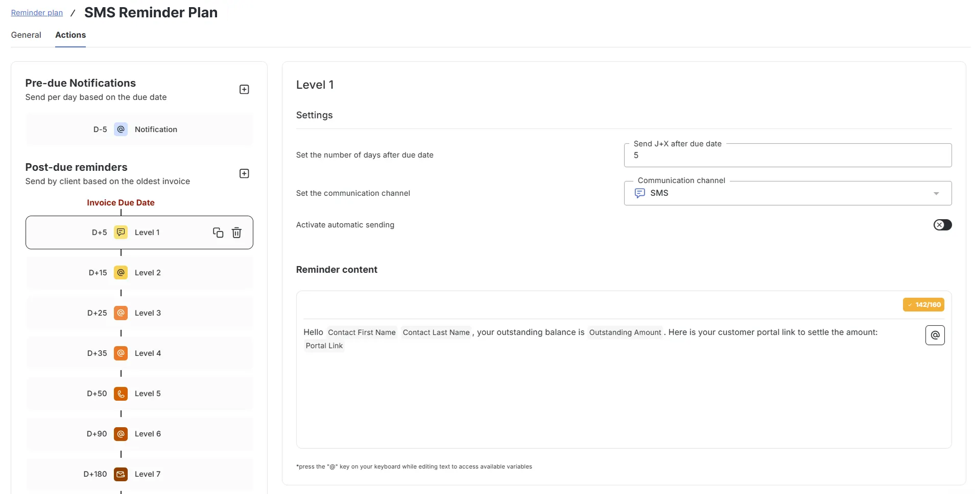 Thanks to our partnership with smsmode©, you can use SMS as a communication channel for your customer reminders. Simply add a new step to your reminder sequence and select the SMS channel. You can then choose to send the message automatically or manually, set the sender name, and personalise the content using the available variables.