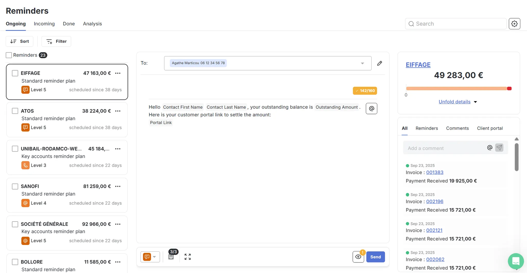 If you prefer to retain control over message sending, all SMS messages to be sent are grouped in the Reminders tab. Each day, LeanPay displays the SMS to be sent based on your customers’ level of delay. You can preview the message, edit it if needed, and approve it before sending.