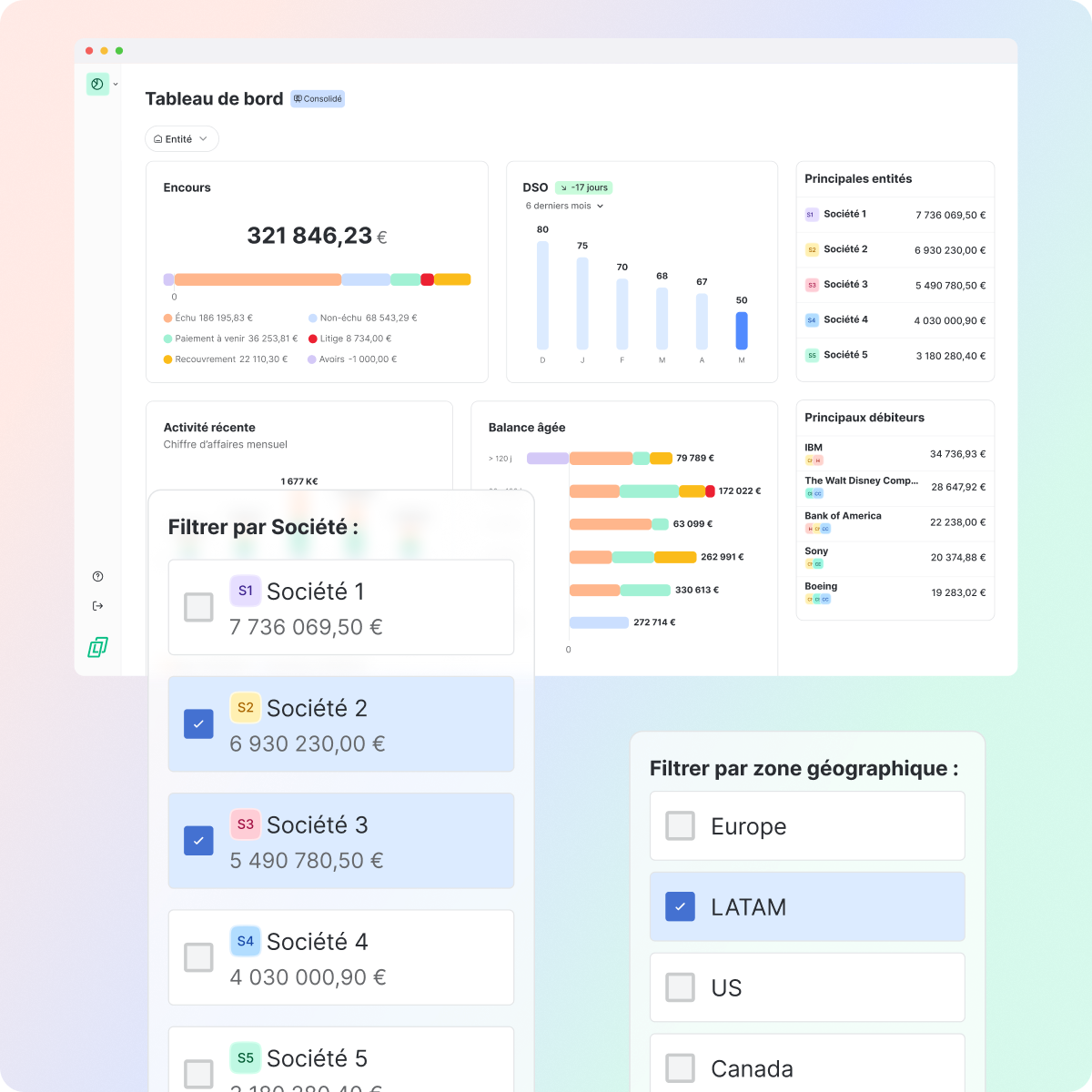 Analysez vos indicateurs clés (DSO, balance âgée, encours) à l’échelle groupe ou par périmètre