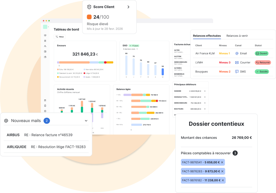 Déclenchez automatiquement des actions selon vos règles (ex : dépassement de DSO, changement de score, encours élevé)