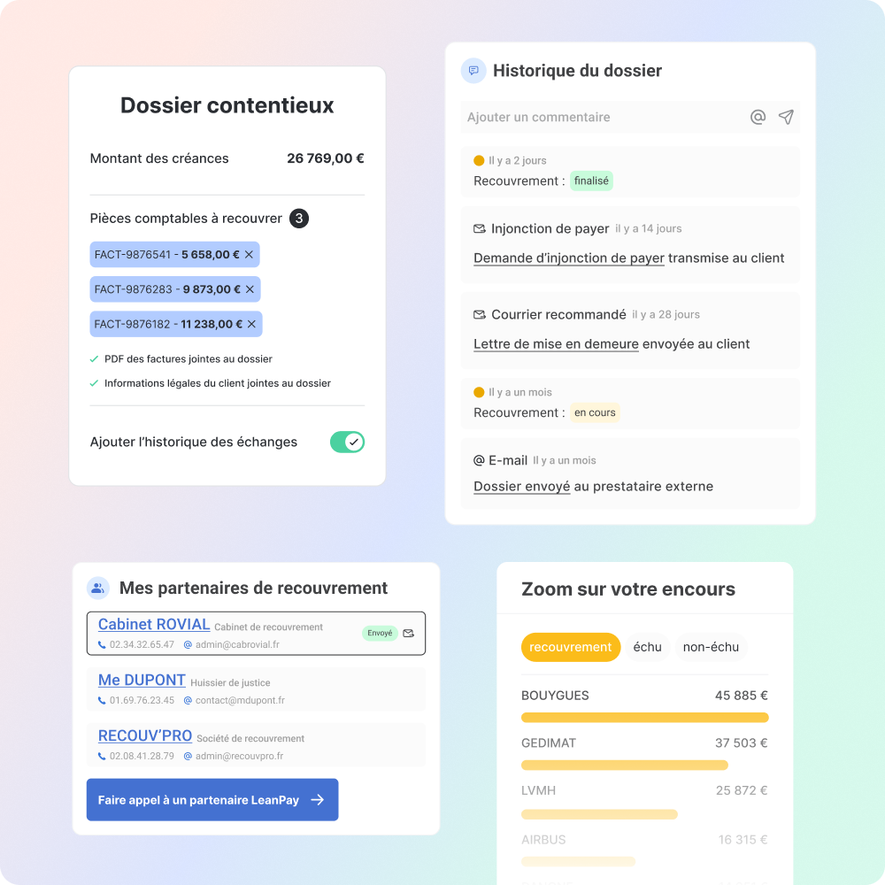 Oui, LeanPay permet d’organiser et de structurer la collaboration entre vos équipes. Vous pouvez définir des rôles et des droits d’accès selon les profils (finance, ADV, commerciaux, direction), attribuer des tâches et piloter des portefeuilles clients. Chaque utilisateur accède à une vision adaptée à son périmètre, tout en partageant une information centralisée et à jour.