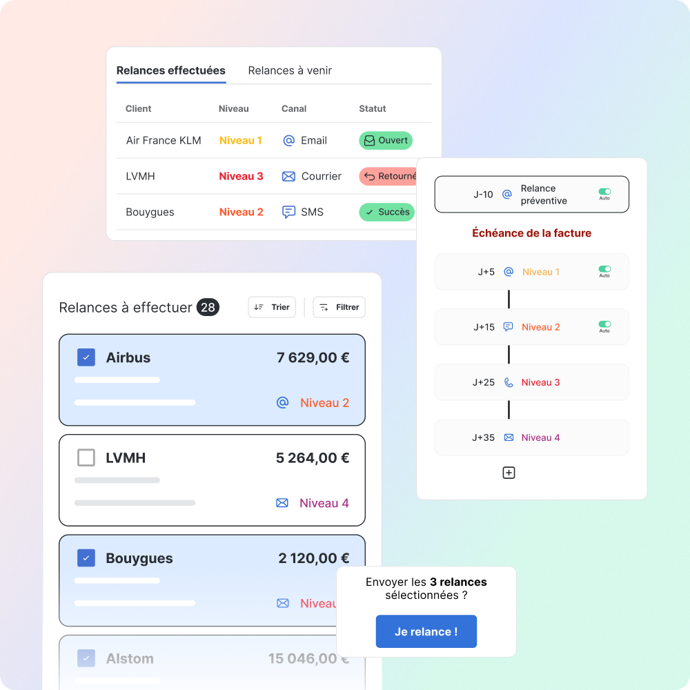 Paramétrez les étapes, délais et canaux de relance selon vos règles de gestion