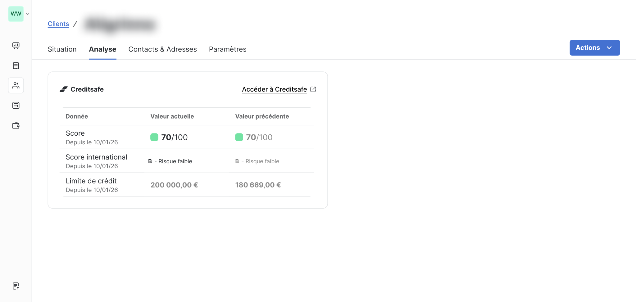 LeanPay se connecte à Creditsafe et affiche automatiquement les indicateurs clés de risque directement dans vos listes et fiches clients.